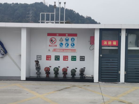 加油站安裝有汽油卸油和加油油氣回收系統(tǒng)。加油區(qū)設(shè)置加油罩棚,罩棚為鋼架結(jié)構(gòu),罩棚下設(shè)置2臺(tái)三油品六槍潛油泵式加油機(jī)、1臺(tái)單油品四槍潛油泵式加油機(jī)、1臺(tái)雙油品四槍潛油泵式加油機(jī)、1臺(tái)尿素加注機(jī);埋地罐區(qū)設(shè)有5只30m³埋地臥式鋼制單層油罐(防滲罐池內(nèi)),其中汽油罐4只(分別為92#汽油罐2只、95#和98#汽油罐各1只),柴油罐1只,油罐總?cè)莘e折算為135m3(柴油罐折半計(jì)入),根據(jù)《汽車加油加氣加氫站技術(shù)標(biāo)準(zhǔn)》GB50156-2021的相關(guān)規(guī)定,該加油站為二級(jí)加油站。